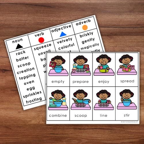 ✔ Parts of Speech Sorting – Categorize words into baking nouns, action verbs, and descriptive adjectives.
