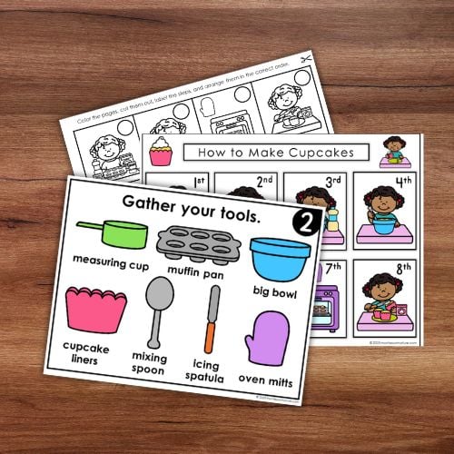 ✔ Celebration Sequencing Cards & Numbers – Reinforce the logical order of the cupcake-making process from mixing batter to decorative frosting.