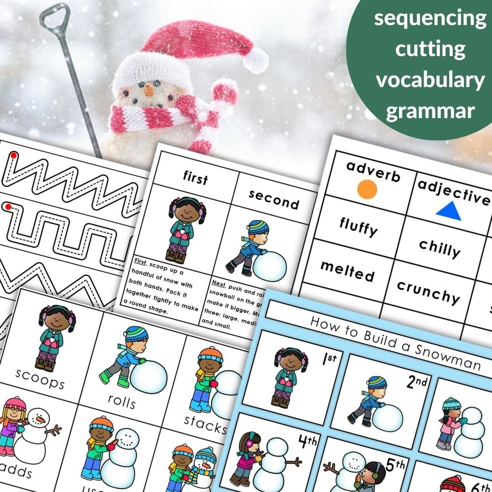 Sequencing & Practical Life: How to Build a Snowman Sequencing Cards and How to Dress for Snowy Weather Sequencing Cards with integrated grammar, tracing, and cutting activities.