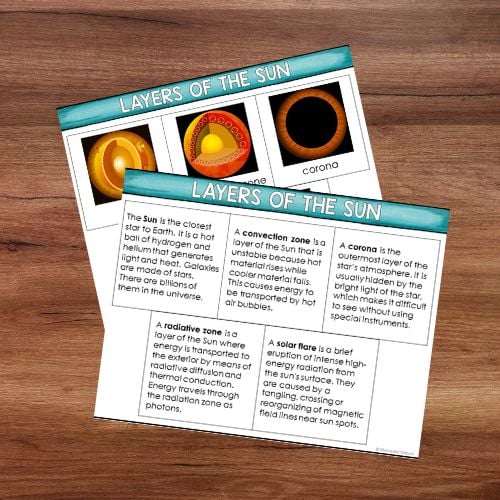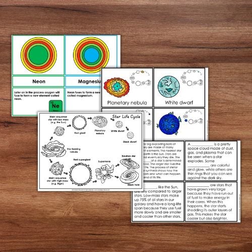 The Universe & Earth: Layers of the Earth, Layers of the Atmosphere, Moon Phases (N. & S. Hemisphere), Star Life Cycle, Parts of the Sun, The Water Cycle, Three Types of Rocks.